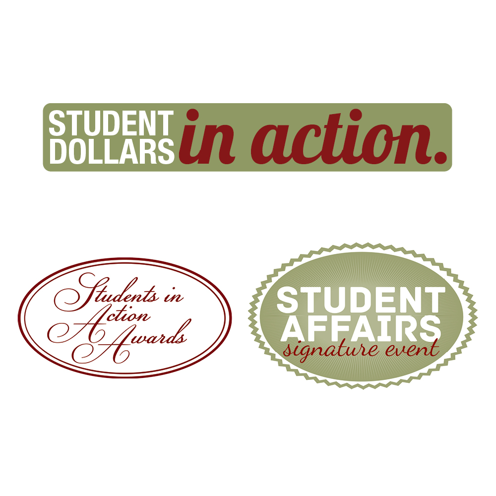 Student Dollars in Action logo is used on event ads to denote Student Senate-funded events. The Students in Action Awards is an honors assembly for underclassmen. Student Affairs is a combination of departments and wanted to consistently mark their major events throughout the year, such as Sophomore Pinning (where sophomores declare their majors).