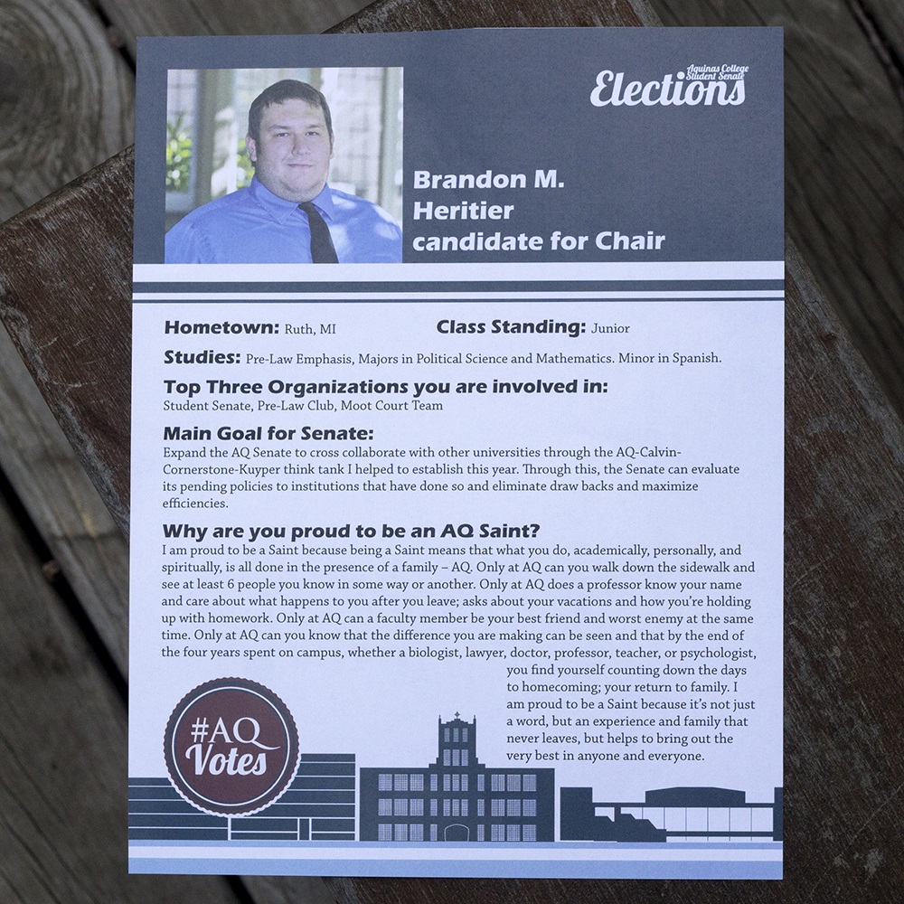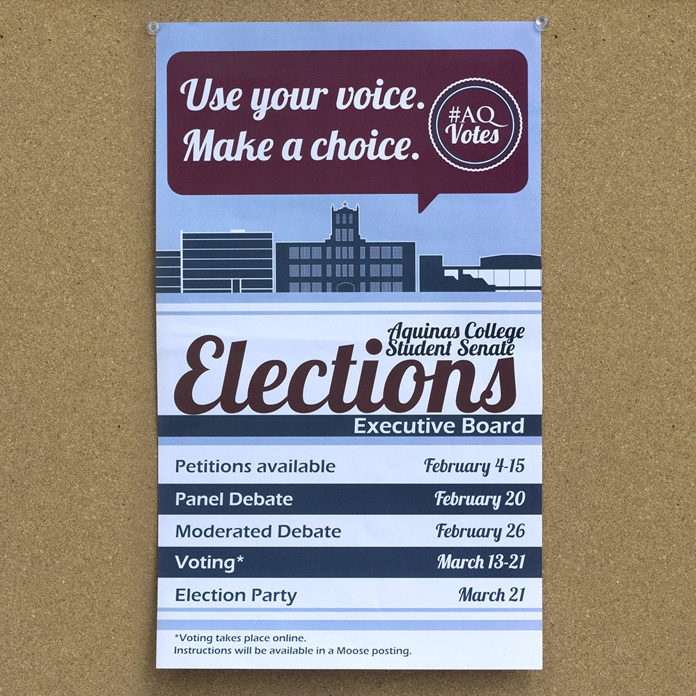 In addition to the button, my clients desired a cohesive, identifying style for the ads and other print collateral related to the Student Senate elections, so students would notice all the events and understand more quickly that they are related. I used a specific subset of the college's official Pantone colors (the primary maroon, and two blues included in the tertiary colors) to unify the designs, as well as repeating the same typefaces across all designs, particularly making use of the Eras font family's different weights and similar feel to "Lobster," the script font used in most of these pieces. I also created a matching set of line illustrations of the college's three classroom buildings: a science building, a main academic building, and a fine arts center.
