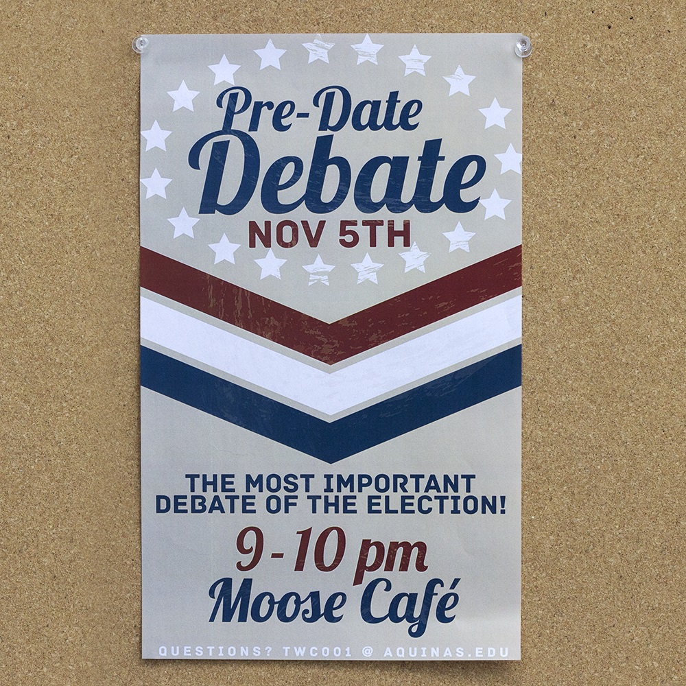 Materials for this overall campaign ranged in size from the 2” button, to a wide-format digital ad displayed on various TV screens around campus, to multiple foam-board-mounted profiles displayed on easels, to a 72” vertical banner hung in the tall, stairway entrance to the dining hall.