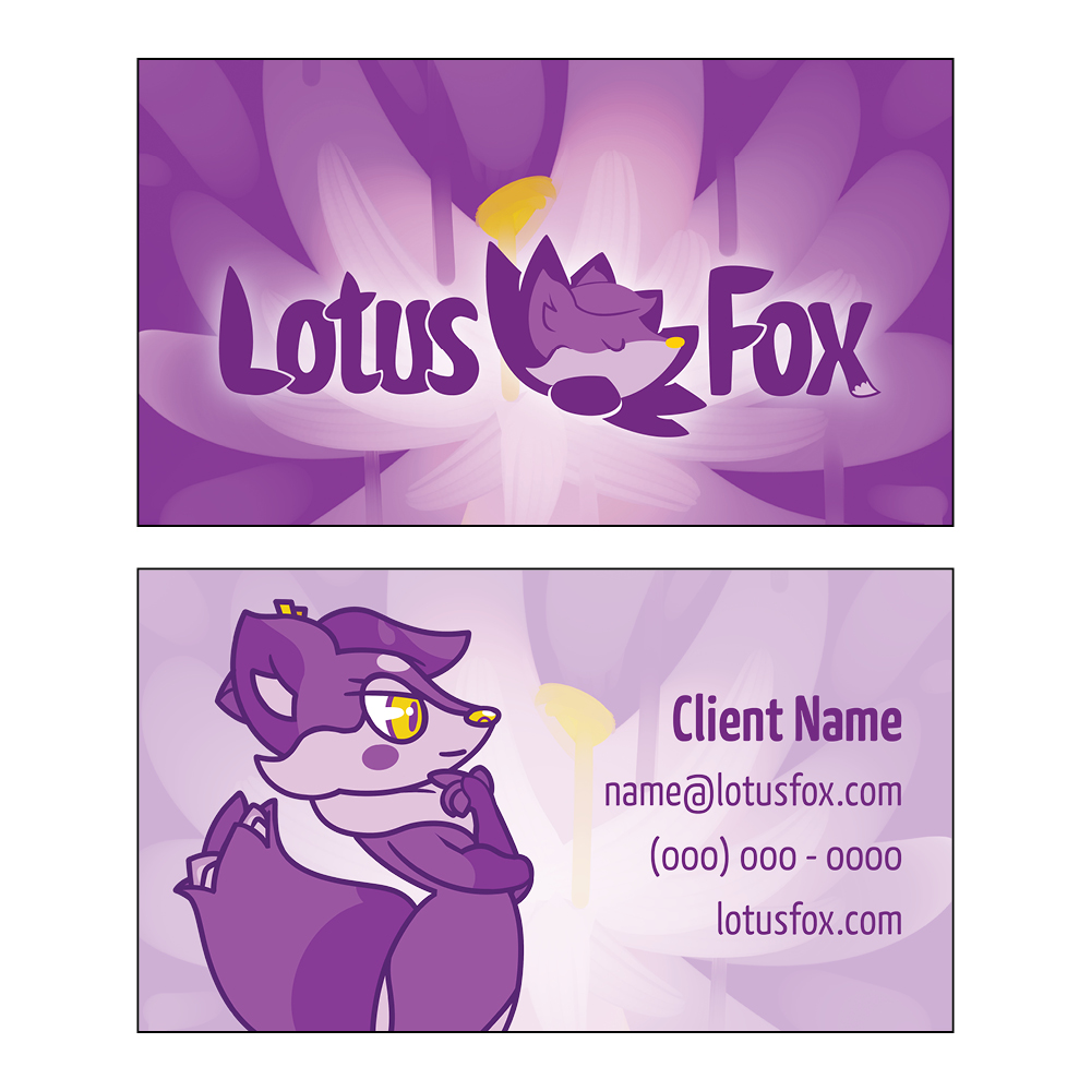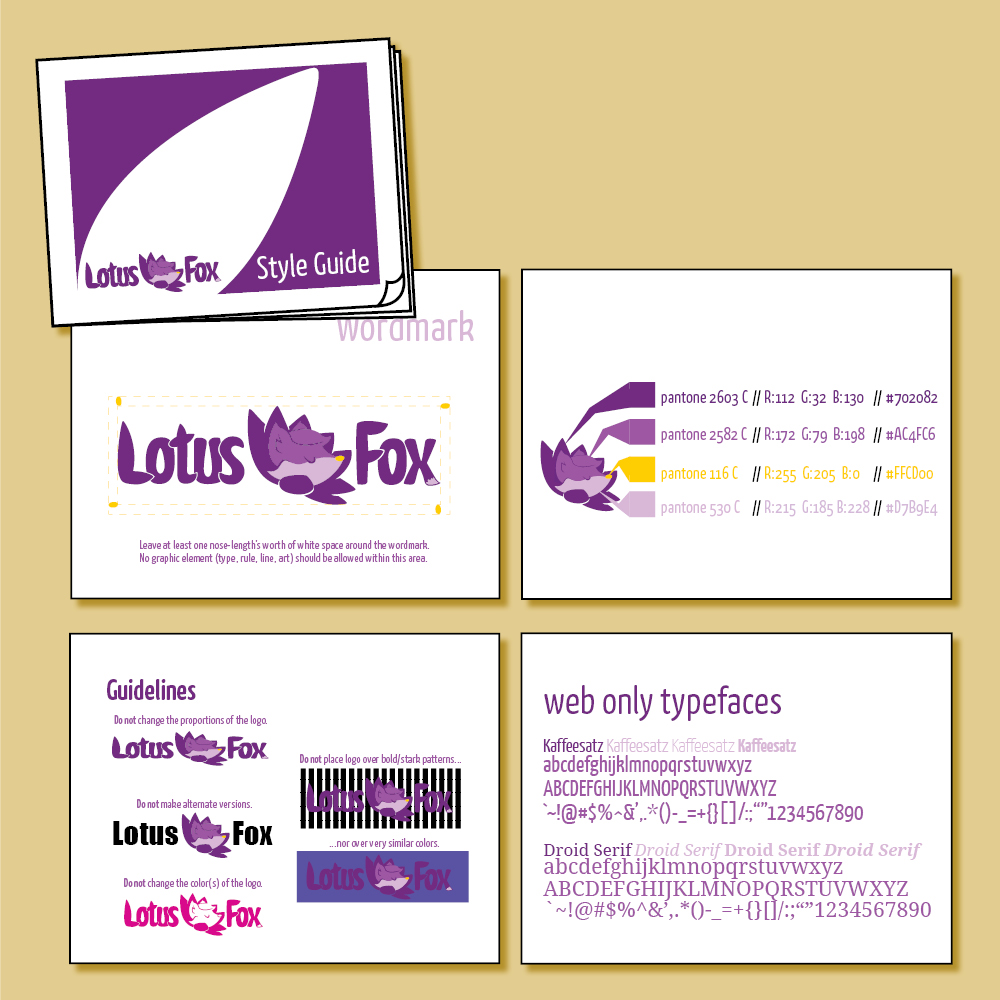 A new company called Lotus Fox Studios needed brand identity materials and its founder contacted an illustrator friend of mine and me. The company is working on producing creative tools, education aids, and games. The itemized production list on our final contract included a mascot design, alternate pose mascot mascot illustrations, Full Color and One Color variations of the logo & wordmark, a business card design, a web header, a vanity plate, and a brand standards reference document.