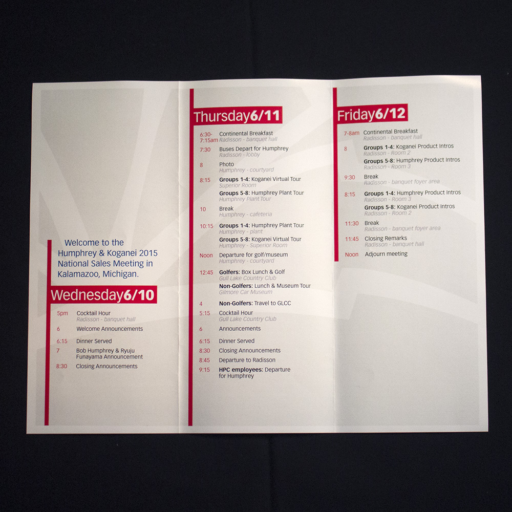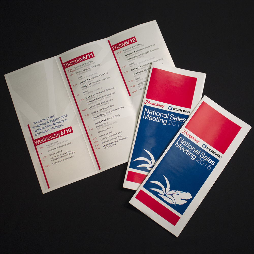 Humphrey Products Company and Koganei Coproration have been partners for decades. In June of 2015 they hosted a joint, multi-day meeting to share new products and announcements with representatives of their North American distributors. I created an event logo to be used on multiple items, particularly the tri-fold schedule participants consulted all three days.