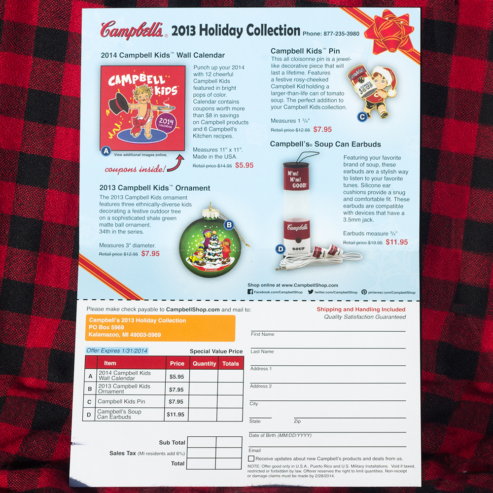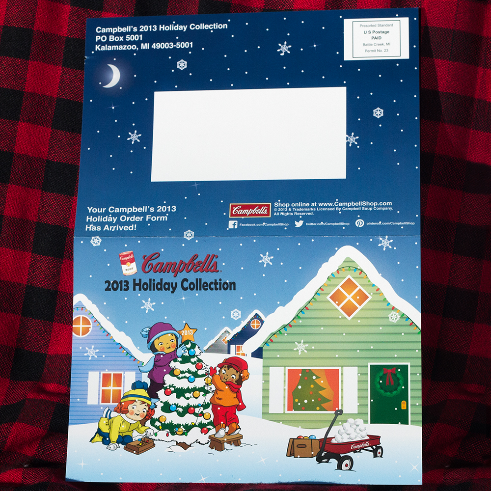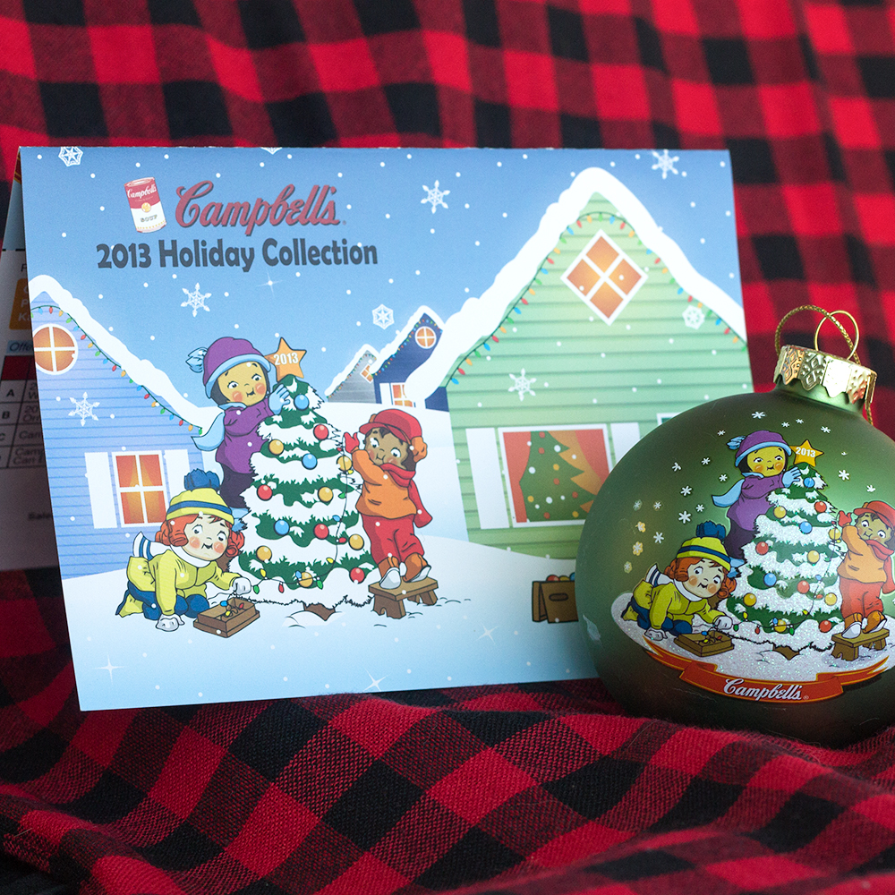 Each year Campbell Soup Company sells Christmas merchandise, including an ornament with a new design, based on vintage official art of their Campbell Kids™. The file needs to be vector art, for a screen printing onto the bulb, but still retain qualities of the vintage art, particularly the kids’ rosy cheeks. TMP designs and mails out a physical order form because a significant portion of their clientele prefers that to internet ordering.