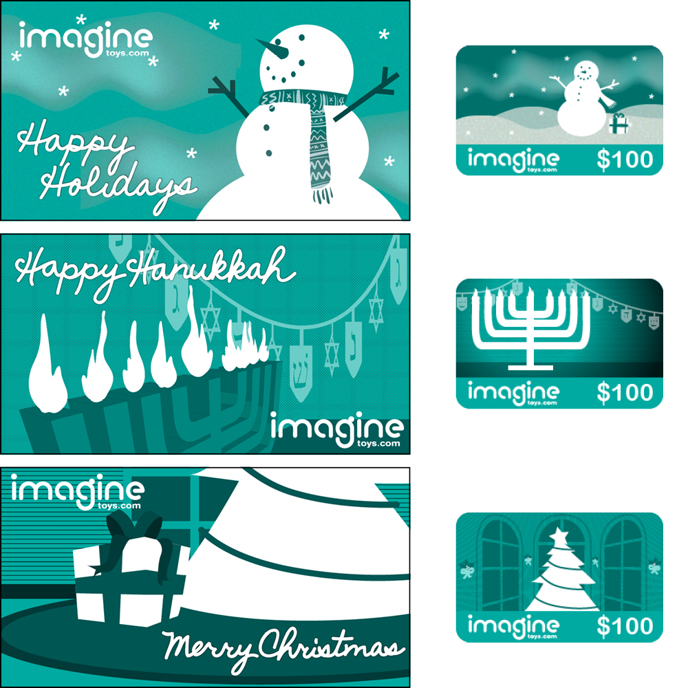 Turnkey Merchandise Programs, LLC manages multiple merchandise sites, and its four biggest are Campbell Soup Company, Kellogg’s, USA Hockey, and Imagine Toys. My supervisor asked me to create web assets for e-gift-cards in the store and matching e-mail header graphics. I designed both year-round and winter holiday asset sets.