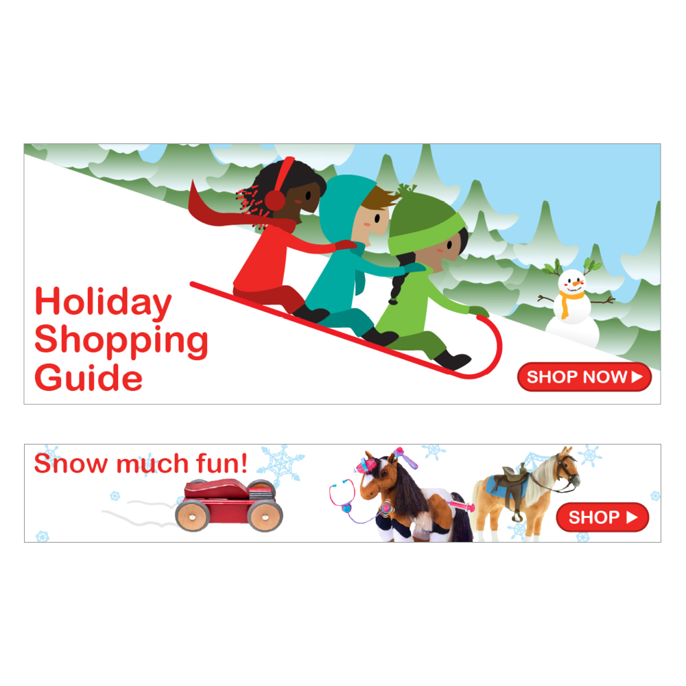Imagine Kids is an online-only toy store run by Turnkey Merchandise Programs, LLC. At the time, they wanted to have some simple graphic illustrations of kids playing, some generic and some for certain times of year. The illustrations needed to have a unified style, as well, that could potentially be mimicked by other designers in the future. Most of the illustrations were intended for multiple uses, on both social media pages, banner ads, email headers, and possibly as reduced-opacity elements in the store’s own website background.