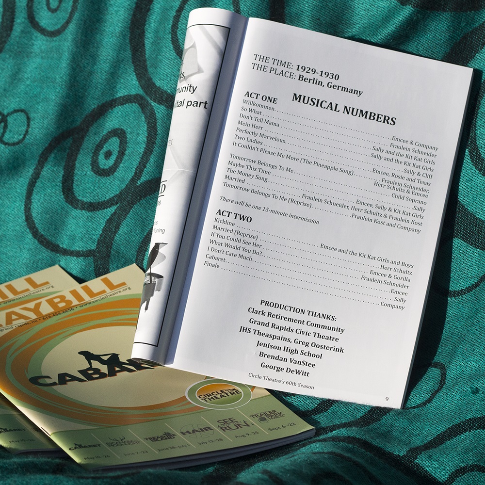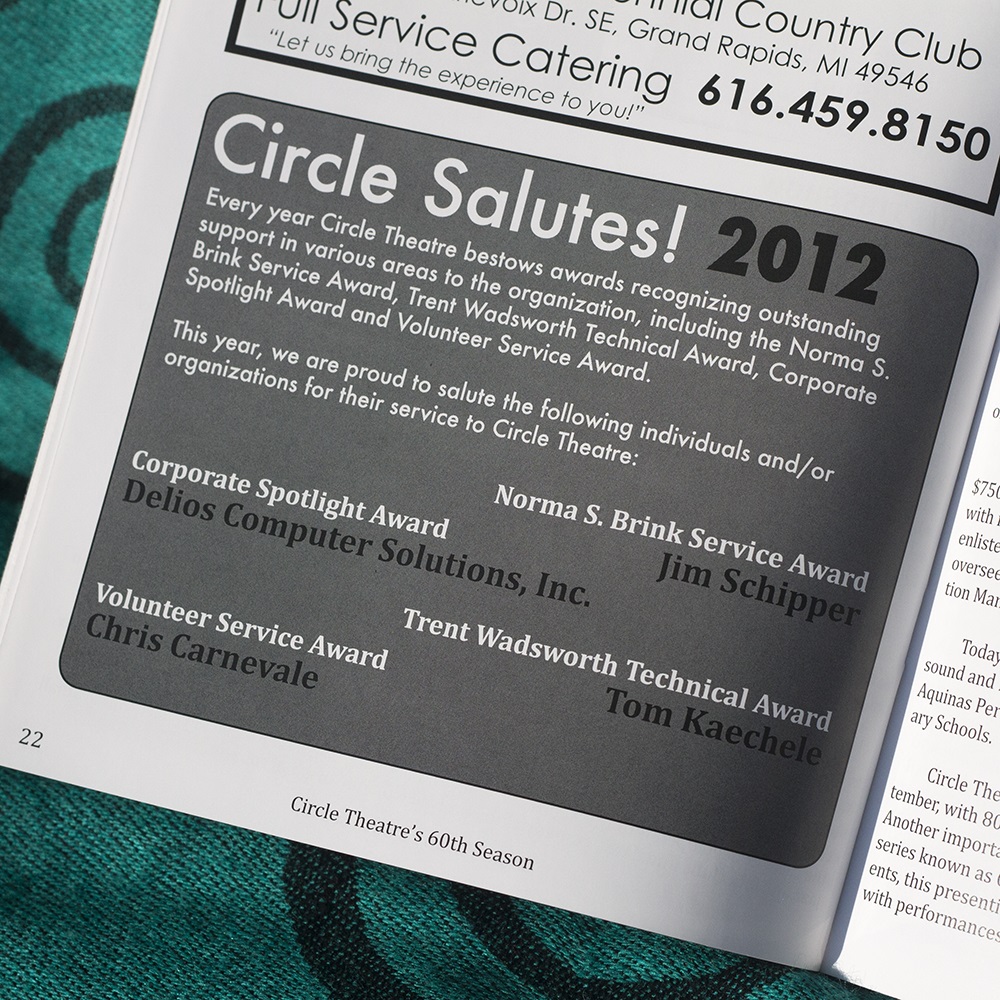 Circle Theatre is a small, award-winning theater in Grand Rapids, Michigan. They tasked me with laying out 50+ page playbills for each of their shows during their 2012 season. I organized donor lists, ad layouts, and cast bios and all sorts of other information, as well as created advertisement blocks for some small businesses (SpeakEZ Lounge).