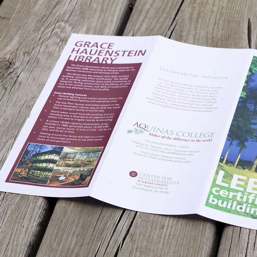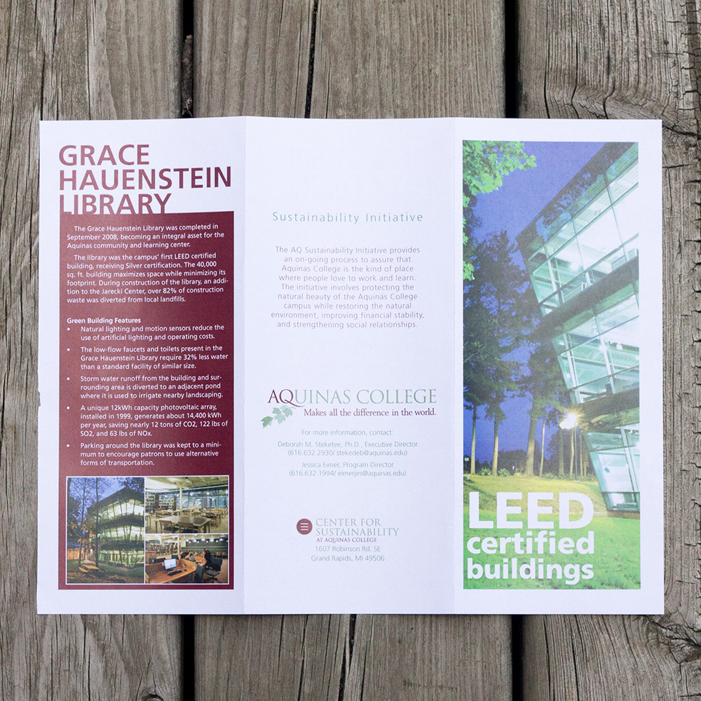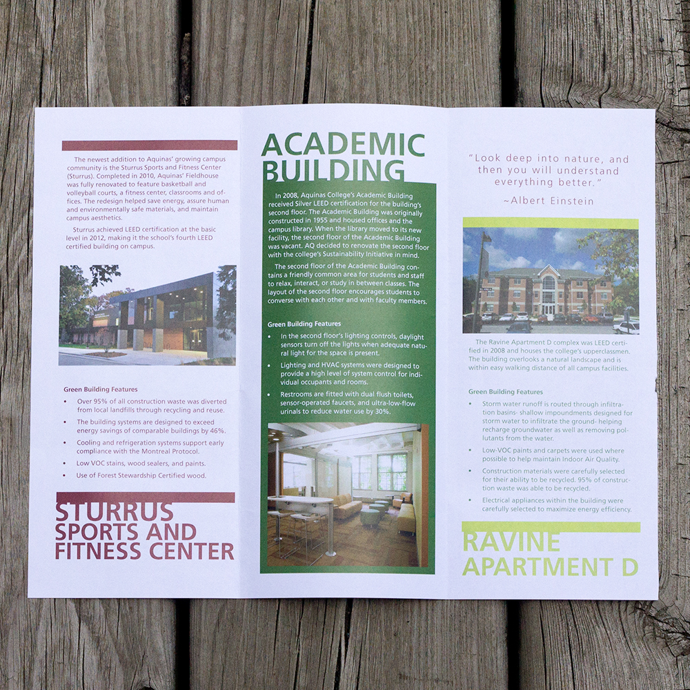 An official informational brochure about the buildings on the Aquinas College campus that are LEED certified, and exactly what makes them that way. I sifted through the college's official photo collection to find good photos of each building and created the brochure from scratch, abiding the college's brand standards. The design was specifically made to be able to printed in the Graphic Services center on campus, rather than needing to be printed with bleed off-site somewhere each time more are needed.