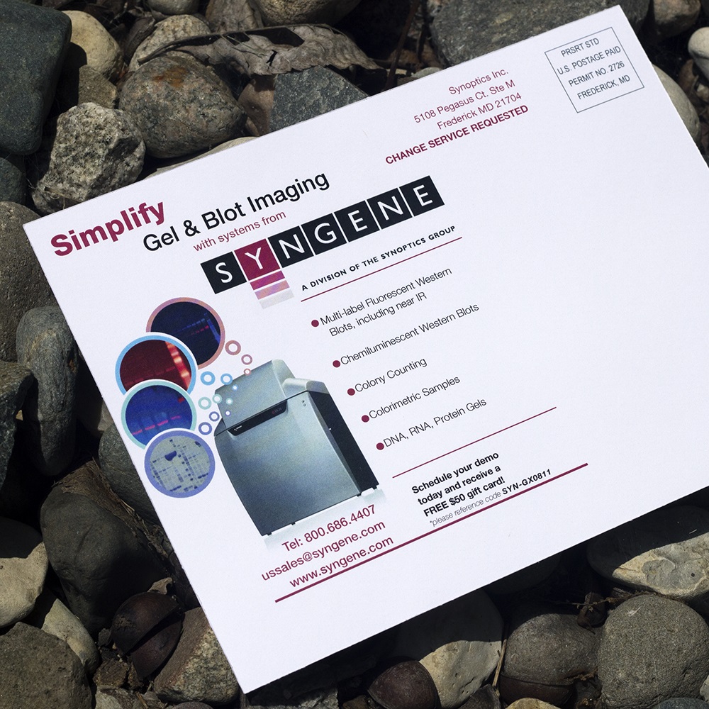 In the summer of 2011, The Synoptics Group sought to advertise products developed by two of their divisions with business-to-business direct-mail postcards. Because the divisions develop products intended for different target audiences, the messaging and imagery would be separate. The product from Syngene served a basic function, and would be targeted at smaller labs who were not necessarily familiar with the Synoptics group. The product from Synbiosis was a more premium one because of its automated features, so it was aimed at larger labs with more potential budget to spare. Being a young designer eager to prove myself, I proposed to them that I would plan, shoot, and edit the photos I would be using, rather than searching for stock images, and they agreed.
